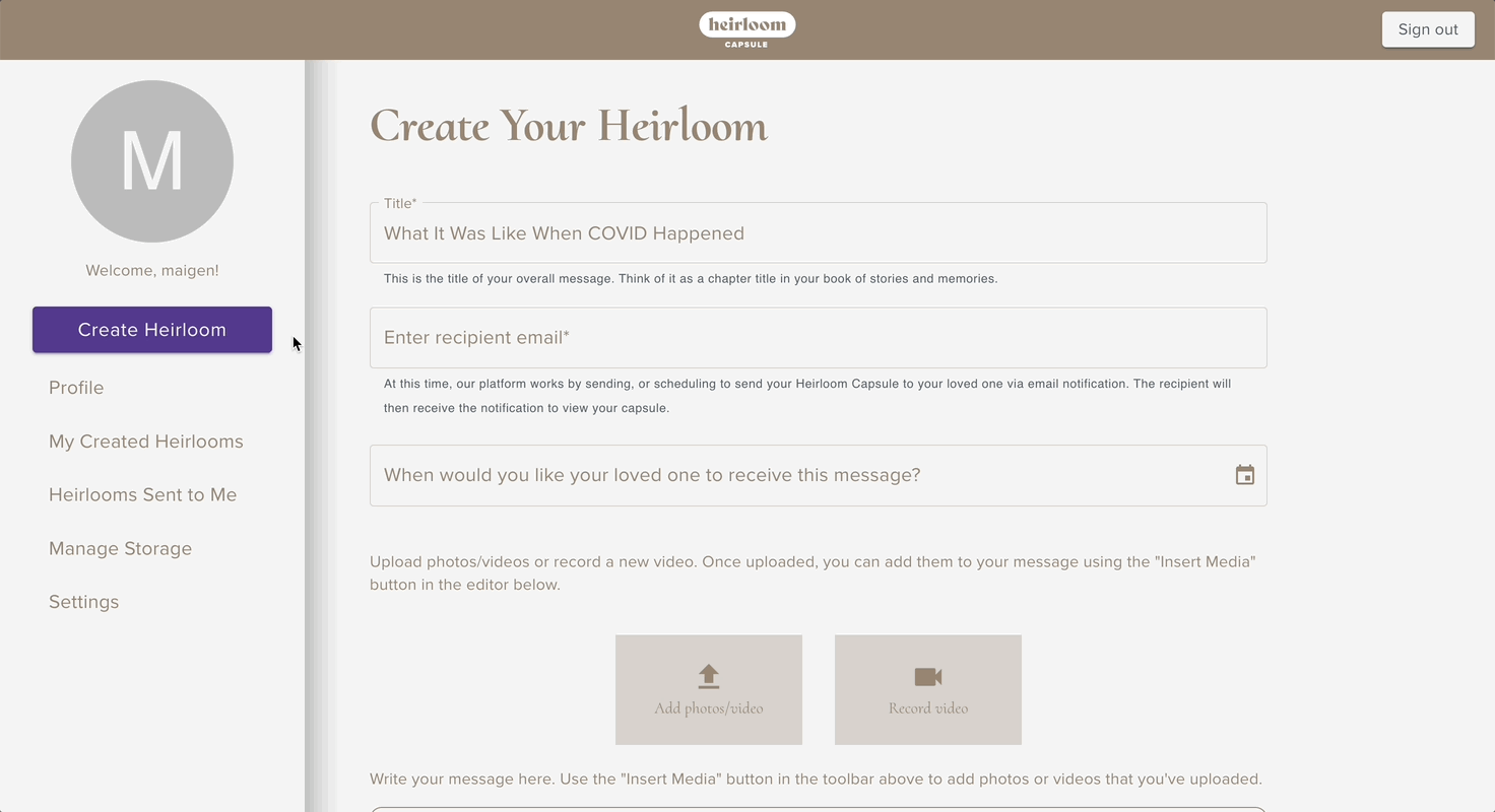 Heirloom Capsule is a way to timelessly capture the stories, experiences, and “whys” that make your family what it is. You’d create an account, create an heirloom complete with images, videos, files, ± audio recordings, and send it to a loved one right now, or schedule it to send years from now. The choice is yours.